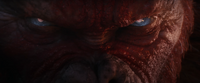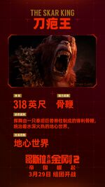 In 2027, a trap set by Kong inadvertently exposed an entrance to the second layer of the Hollow Earth where Godzilla had sealed away the Skar King and his subjects in ancient times. The Skar King soon emerged, destroying Monarch Outpost One and killing all inside, though a single security camera remained intact to record a glimpse of him. When Kong descended to the Skar King's territory, he was soon attacked by three of his Great Ape minions and the young Suko. Kong killed two of the adult apes, while the third escaped, and demanded that Suko lead him to the others. Though neither trusted the other at first, they had become friendlier by the time they reached the Skar King's volcanic lair. At the same time, a small Monarch team discovered an Iwi city in the Hollow Earth; there, Dr. Ilene Andrews translated their writings and learned of the Skar King's history and desire to conquer the surface world. After Kong knocked out a guard for pummeling another ape, the Great Ape One-Eye alerted the Skar King to his presence, and he emerged from his chamber to take stock of the ape Titan. The other apes bowed before him and joined his laughter at Kong's titanium tooth, even a reluctant Suko. The Skar King nonetheless confronted the young ape, only for the Great Ape Gnarled Finger to defend Suko. The Skar King seemingly relented, then kicked Gnarled Finger into a lava lake. Suko cried out in sorrow, and the furious Kong bellowed a challenge to the tyrant. The Skar King proved a nimble opponent, his Whipslash possessing far greater range than Kong's battle axe. He disarmed Kong, then tried choking him out with the Whipslash. Kong flipped him over his shoulders and threw him back, prompting the Skar King to call upon his ultimate weapon: a chained reptilian Titan, Shimo, who towered over them both. He ordered her to attack Kong using the blue crystal at the end of his Whipslash, and though reluctant to do so, she gave into the pain caused by the device. With no defense against her ice breath, Kong was forced to retreat with a frostbitten hand. The Skar King hoisted Kong's axe in victory and ordered a group of apes to give chase.