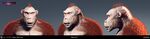 Initially conceptualized with an Autodesk Mudbox sculpt resembling an orangutan, the Skar King's body was reshaped to contrast Kong's, becoming lanky and agile. Regarding the characters' differences, animation supervisor Ludovic Chailloleau highlighted, "He's always very sneaky. He's not frontal like Kong. He's more asymmetrical in the way he moves".[15] The Skar King's final design was created by Jared Krichevsky, who was inspired by hairless apes and gibbons.[16] Krichevsky's first passes toyed with radically different hairstyles and levels of fur;[17] at one time he was intended to be bald, but the animators felt it made him look too elderly.[15] To match his personality, Krichevsky designed his face to look like a "total, unpredictable psychopath".[18] The "mutton chop"-like fur on the Skar King's face was inspired by those of Warbat designer Matt Millard.[19]