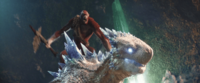 The Skar King can use the crystal at the end of the Whipslash to command Shimo to attack, doing so by pointing it at his desired target. This process causes Shimo significant pain through unknown means until she obeys the command given to her, as she was seen slamming her head against the ground when he first used the crystal to command her to attack Kong. This crystal also doubles as a sharp weapon, as it lacerated Kong's hand. However, upon its destruction Shimo was freed from the Skar King’s control. The novelization of Godzilla x Kong: The New Empire suggests that this crystal was broken off from Shimo's back spines.[21]
