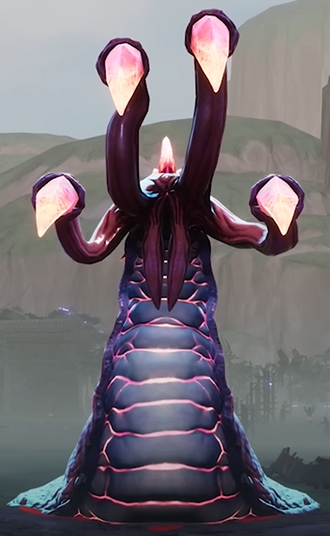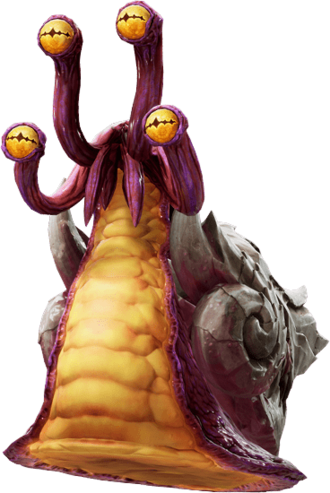 Skorak is a giant mollusk resembling a slug that carries a colossal skull on his back like a snail shell. He has four stalk eyes that end in golden sclera, yellow irises, and black, horizontal pupils. Each eyeball has a large fang located behind the eyes that extend through the pupils and allows Skorak to slash at enemies[8]. His mouth is located at the base of where the stalks meet. The mouth is passively small and tucked near Skorak's face, but when in use, extends and stretches outwards, lined with rows of teeth, in a sideways-opening. He has a slug-like body shape, but the front of his body is more upright, with a purple hue covering most of Skorak's body and yellow on his underbelly. The skull on Skorak's back is confirmed to be Rawa's, albeit with the large nasal horn snapped off (as it was salvaged by the Dragon King's loyalists to revive him) and possessing a more pronounced jaw bone. Skorak's S-Class form depicts him with all of his eye fangs fully extended, larger, and sticking through the back of the eyes, and he glows with pink and orange energy. His back is covered in orange-tipped spines and his body has glowing lines of orange energy all over it. The skull Skorak carries scales up along with him and has a darker hue, and also glows with a pinkish-orange energy.