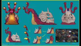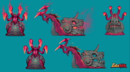 Some initial ideas for Skorak included a giant crab, hermit crab, insect, before eventually landing on a mollusk. The development team also wanted to deviate from a humanoid-shaped monster, as the game's roster already included four such creatures. They chose the mollusk-like creature due to its novelty among kaiju designs.[6] When designing Skorak, the director instructed concept artist Keen Fai to come up with a "Snailian" kaiju design, and that it needed to be an "unpredictable" character, with Fai also using Ultra Q's Namegon for reference.[7] They experimented with the monster's number of heads, number of eyes, and width, with a variety of color schemes. They also tried a few different designs for the skull, including some wider or narrower snouts, different styles of crests, spines, and horns, and even skeletal claws coming from the skull's mouth. After the design for the skull was finalized, they came up with some final touches, such as an active eyeball and tentacles that would appear when the skull was launched from Skorak's back and when it moved around, although these were both ultimately scrapped.