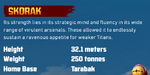 - Skorak is the slowest-moving Titan in GigaBash.[9]