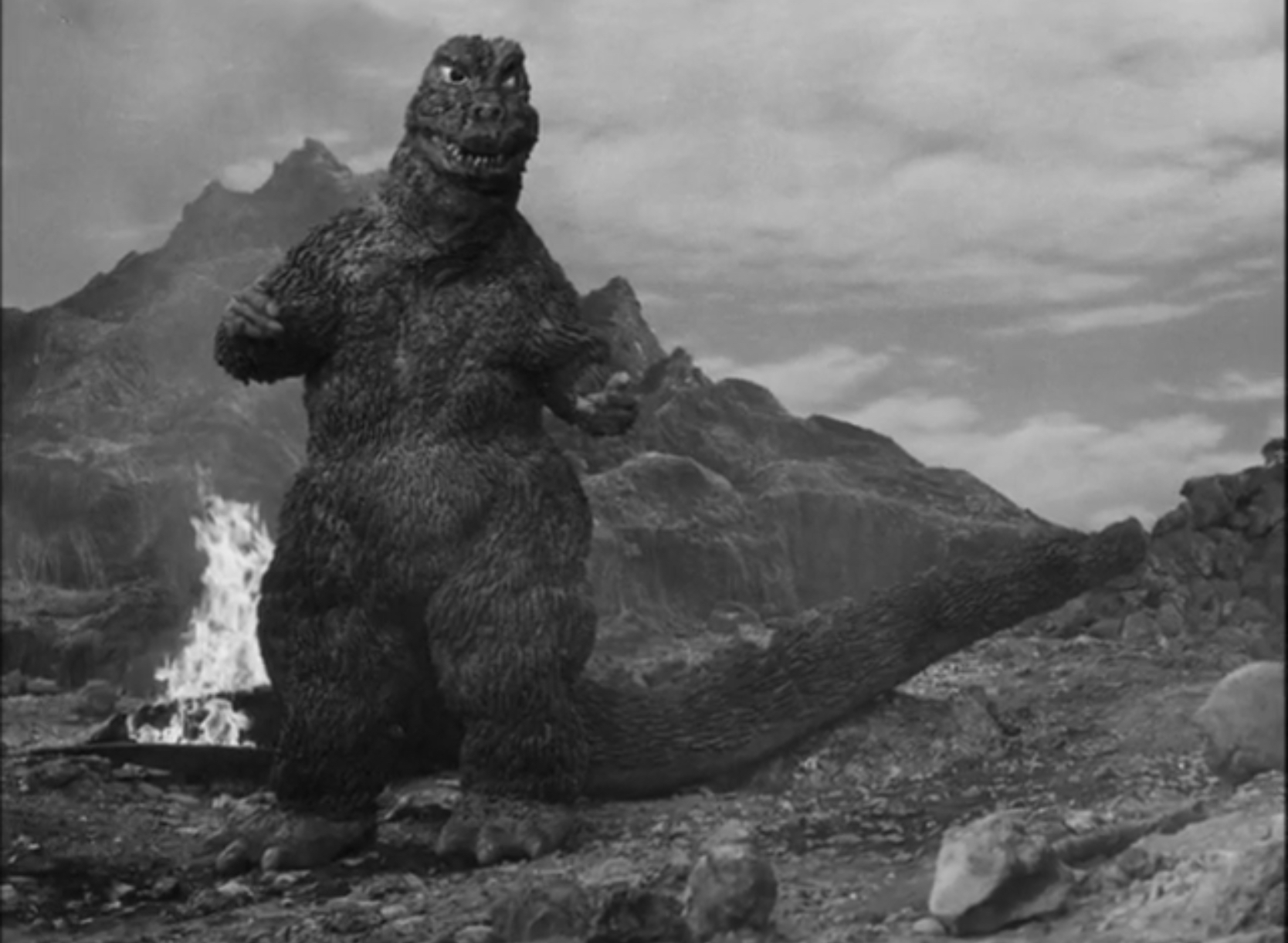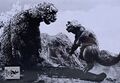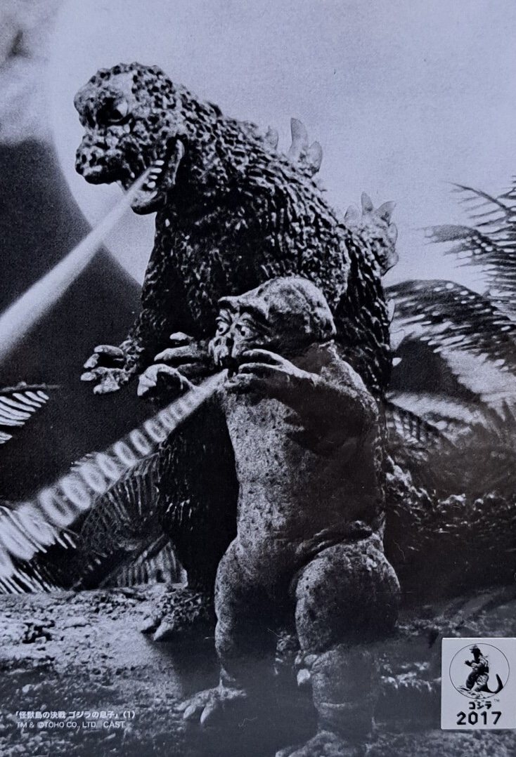 Minilla about to fire atomic breath as his father steps on his tail