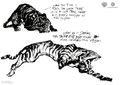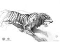 [The characters] had landed on the island and spent the night on the beach before they traveled inland. They sit around and drink beer by a fire and sing sailor shanties. I just loved it, but it was a bit kind of tangential to having to get to the meat of the matter. In the morning after this raucous night, two saber-toothed tigers come out of the jungle and sniff around the camp. Someone says, "Don't shoot and they'll go away," but the guy takes the shot and kills one. They were a pair, a male and a female, and the other one just goes nuts. It kills the guy who took the shot. It's like the inciting incident of a war, a kind of harbinger; you're in a place you don't know, and now you've awakened more than you know. It was the first indication that we're not in a normal place. There's no such thing as a saber-toothed tiger and it's enormous.