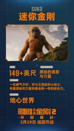 Soon the two arrived at the Skar King's lair, where Suko tried to blend in as Kong challenged a guard who was beating another ape. This drew out the Skar King, who mocked Kong and menaced Suko. Gnarled Finger, an old ape who had been relieved to see the young Titan return, stood between him and the Skar King, and for this was kicked into a pool of magma by the tyrant. Suko cried out in horror, but tried to appear inconspicuous as Kong battled the Skar King, and later the enslaved ice Titan Shimo. Seeing that Kong was no match for her frost breath, Suko directed him to an exit, although he was pursued by many of Skar King's subjects. Kong lured them into one of his hunting traps, but the other apes were too smart to trigger its tripwire, leaving the injured Kong in peril. Suko, from atop the ravine, pushed the trap into motion, raining boulders down onto the menacing apes and killing all but one. Kong then led Suko to a hidden Iwi civilization where his human friend Jia was responding to a distress call. After Kong collapsed from the frostbite inflicted by Shimo, Suko panicked and ran off, where he discovered that the Skar King, Shimo, and a posse of apes were on the move. Suko returned to Kong, who Monarch had equipped with the B.E.A.S.T. Glove, and the older ape returned to the surface to lure Godzilla to Hollow Earth to help fight the Skar King and Shimo.