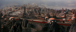 Terra is a rocky and inhospitable planet. Much of the surface is covered in sharp, stalagmite-like rocks that vary in appearance, typically brown or grey, though some rocks have a faint purple coloration. As the Terrans can control the weather, they are able to make the surface colder and are able to cover parts of it with snow, which Gamera later used to ice wounds he sustained in battle with Guiron. The planet also sports a vast complex of structures built by the Terrans, most of which resemble silver and red domes with long corridors to connect them. Conical teleportation structures are seen both outside of and within these buildings.