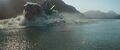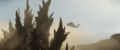 2015: The ground cracks beneath the group's feet and Godzilla emerges from beneath it, sending them tumbling off a hill. Kentaro rescues May from one of the vehicles as it falls past them. They linger, watching Godzilla open his eyes. He seems to focus on Cate in particular before getting to his feet. In the process, one of his dorsal plates collides with the helicopter's blades and it crashes. He bellows and stomps away.
