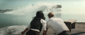 1955: Shaw tells Miura that he belongs here with her, but she cuts him off, saying that his job is to protect Monarch, not her. He responds that Monarch couldn't exist without her. Sitting on opposite sides of a bench, she tells him they can't have a relationship, can't risk making decisions based on what they want instead of what Monarch needs. It could cost them everything. Shaw says he doesn't care, and they finally kiss, but Miura breaks away tearfully, saying, "Yes. You do." She realizes first that the gamma ray transmitter has disappeared under the waves. It rockets out of the water towards them, Shaw knocking Miura out of the way as it impacts against the shore. Godzilla surfaces behind them, roaring, then swims back towards open water. Shaw is awed to realizes the hydrogen bomb failed to kill him; Miura smiles.