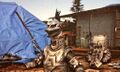 Godzilla fights Mechagodzilla 2 and Titanosaurus in the ruins of Tokyo at night