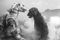 Godzilla holds Mechagodzilla 2's head after tearing it off of its body