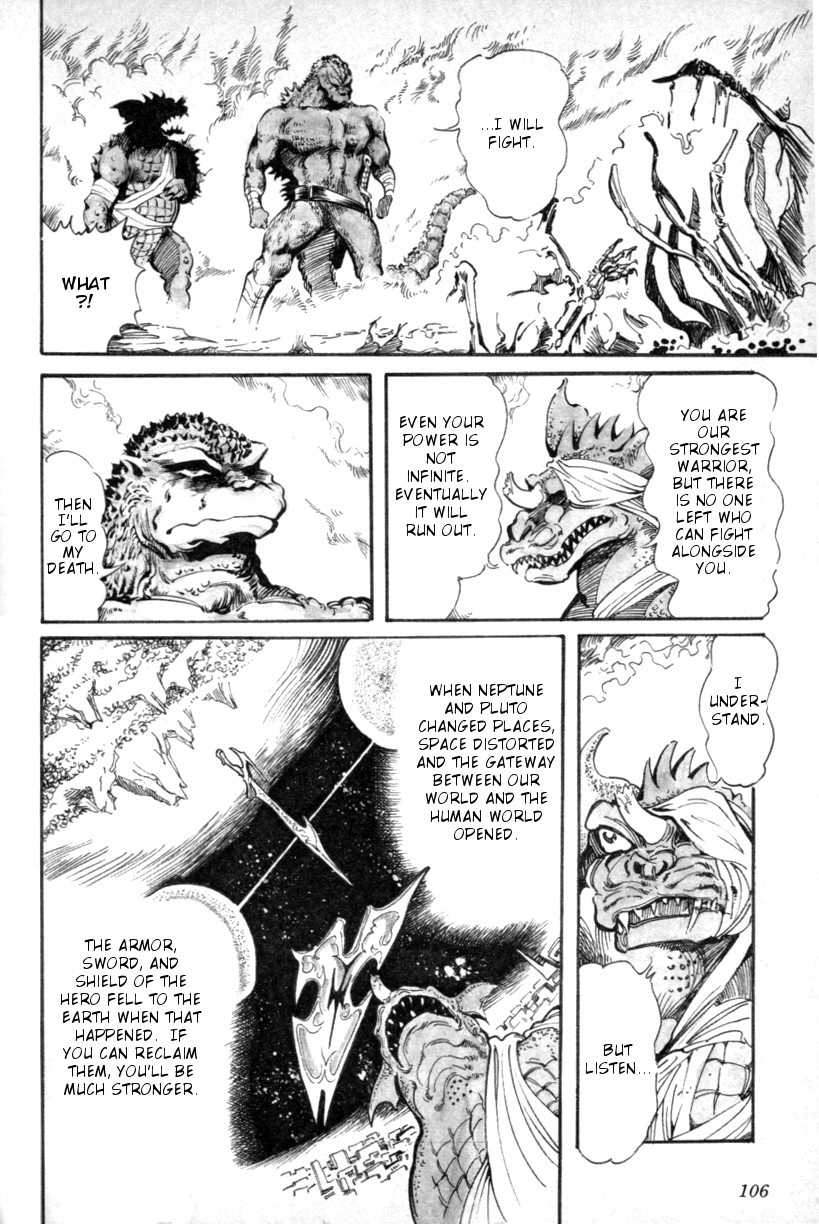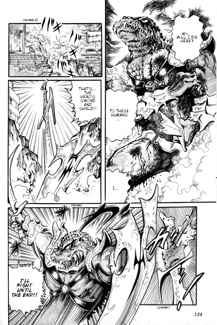 Created by conceptual artist and suit actor "Hurricane" Ryu Hariken, this story depicts Godzilla and other Toho kaiju as humanoid warriors from an alternate reality. Thanks to an advanced human army, they are on the verge of extinction as the humans seek to invade and take over their home world to replace the dying Earth. Godzilla agrees to do battle with them alone, but not before killing Biollante, the traitor who gave the humans the Spirit of the Beast Tree. Baragon also informs him of a legendary sword, shield, and suit of armor that fell to Earth when the rift between the human and monster realities opened. Godzilla arrives in Japan, swiftly destroys the humans' undersea forces, and acquires the armor. A Markalite GYRO launches him into space, but he escapes after it collides with a meteor. He dispatches the humans' space forces, including the Gotengo and the Gohten, then takes on the Super X and the Super X2 with equal success. Burrowing underground, he seemingly kills the Japanese Prime Minister before rescuing the Beast Tree Spirit. She prepares to close the rift. The Prime Minister takes on Godzilla at the helm of Jet Jaguar, backed up by Mechagodzilla, Moguera, and Mechani-Kong. Their weapons wound him, but just then the sword and shield emerge from a fissure. Jet Jaguar hops onto a motorcycle as the Prime Minister raves about the need for humans to colonize the monsters' world so as to replace their own polluted planet. Godzilla finishes all four mechas off with a blast of his atomic breath, then returns to his reality by ascending in a beam of light.