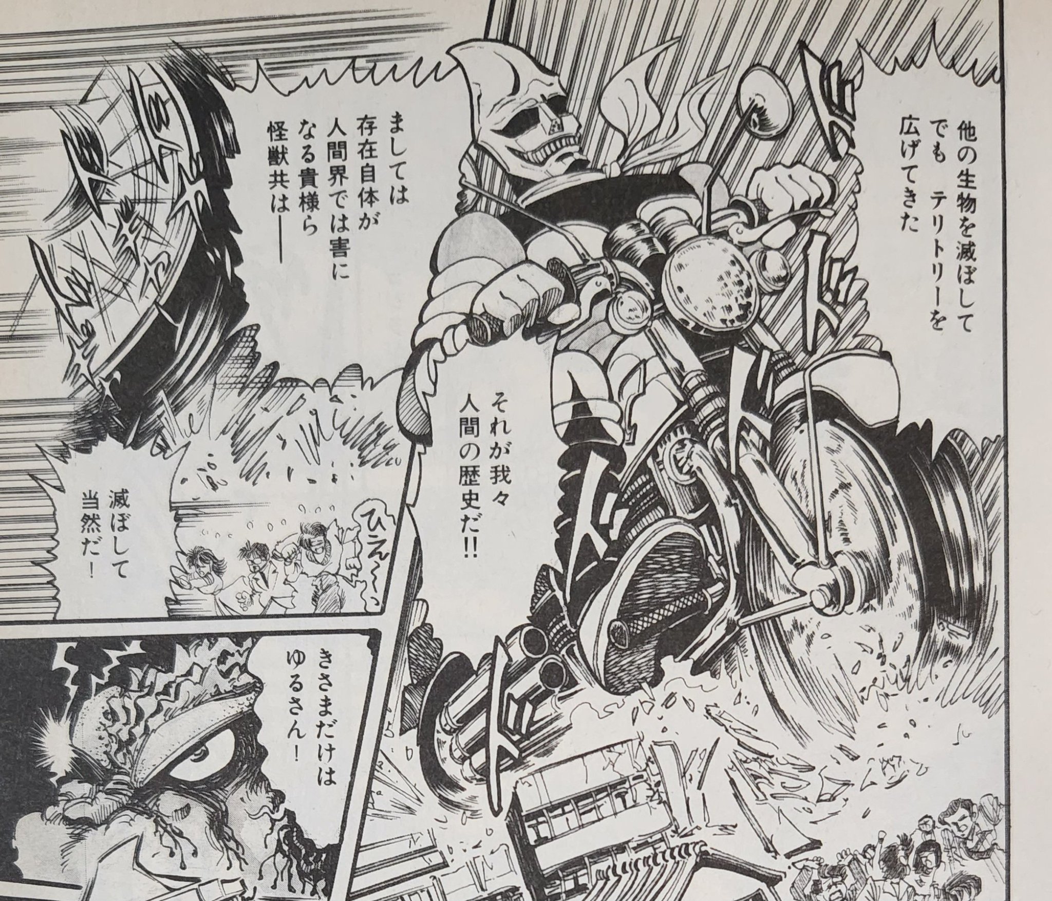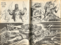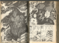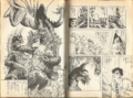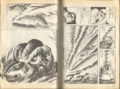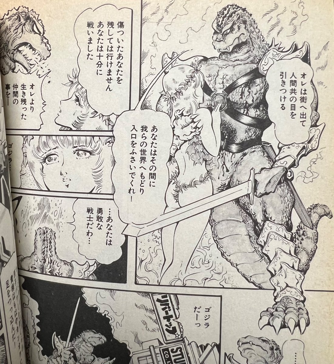 Easily the strangest and most controversial story in the entire book, a martial arts master learns a special killing technique to use against Godzilla. Against all odds the move works and Godzilla is killed, though at the cost of his own life, leaving his pregnant wife a widow. Not long after the child is born he starts behaving strangely, and he reveals that he is actually Godzilla reincarnated in human form before attacking his mother. The story from there on takes a weird ride through the spirit world.