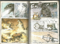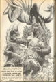 - "Monster Warrior Godzilla" features multiple Toho monsters who, at that time, had yet to cross over into the Godzilla series: the Space Beastman, Sanda, Maguma, Kamoebas, the Griffon, the Bat Man, Gezora, the Meganulon, Mechani-Kong, and Moguera. The Space Beastman and the Bat Man are all depicted as kaiju-sized despite being roughly human-sized in their original film appearances.