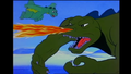 At the oil rig, the magnetic turtle reveals itself and attacks the site, consuming all the metal in the area by firing magnetic waves from its mouth, and pulling them, as well as causing a massive oil spill. The crew arrives on the scene to discover the turtle on its rampage, revealing who had been behind the spike in magnetic energy. At that moment, the turtle notices the Calico and attempts to eat it too. Luckily, Majors calls on Godzilla, who arrives just in time to save their ship from the giant turtle's waves. Godzilla battles with the magnetic turtle, but its incredibly powerful magnetic waves causes all of Godzilla's attacks to bounce off of it. At one point, a fireball that was repelled by the turtle lands on the oil spill, causing a massive fire that traps the Calico inside of it. Realizing that the crew is in danger, Godzilla goes off to rescue them and to put out the fire, but in doing so, the turtle retreats from the fight.