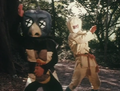 As Coonjo was walking along a wooded path, she encountered the Perceptive Yokai, who began talking with her. As Kotaro, Nyudo and Uragira approached, Uragira and Nyudo began bickering, but Kotaro broke them up. Suddenly, they were halted by the Perceptive Yokai, who stood in the middle of the path. Kotaro instructed Uragira to engage the yokai as a distraction, allowing Nyudo to approach from behind and attempt to whack him with his club. However, the yokai anticipated Nyudo's attack, parrying with a kick to the chest which knocked him to the ground. Kotaro then joined the fray, fighting the yokai off with his naginata. Kotaro whispered to Nyudo to make a maneuver, prompting him to run off to a rotted tree trunk and pull it from the ground. Uragira helped him to roll the tree toward the Perceptive Yokai in an attempt to topple him, but he managed to leap backwards over it. The yokai laughed at his efforts before charging back toward Kotaro. Angered, Nyudo began to run after him while swinging his club, but walked into a tree branch, causing him to lose his grip of the club. The club flew through the air before striking the Perceptive Yokai in the head, greatly disorienting him. Kotaro followed with a slash to the back with his naginata, causing the yokai to fall to the ground dead. Coonjo, who was watching on from behind a tree, fled in anger and the trio resumed their travels.