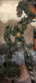 Titan Hunter is a large, green humanoid mech with a yellow light in the middle of its back. It has two horns atop its head which appear to be made from the pincer of an unknown creature.