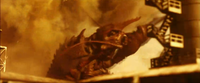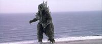 Godzilla came ashore at Tokai in order to feed on the reactors at its nuclear power plant. The JSDF engaged Godzilla outside of the village, using helicopters, tanks, fighter jets, mines, and their new Full Metal Missile Launchers. Godzilla was mostly unfazed by the military's attacks, although the Full Metal Missiles stopped him in his tracks. However, he was suddenly confronted by a giant floating rock, which blasted Godzilla back into the ocean with a laser cannon fired from its side.