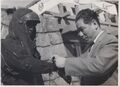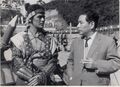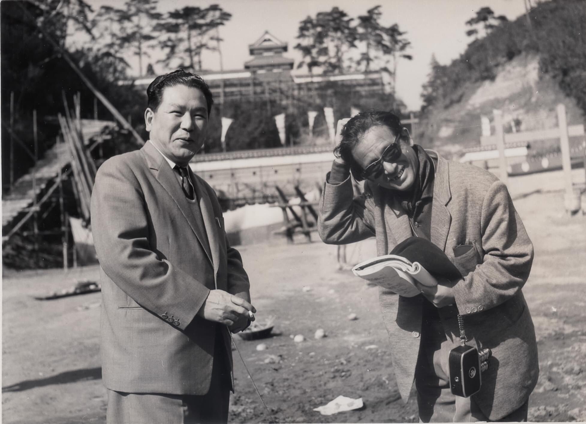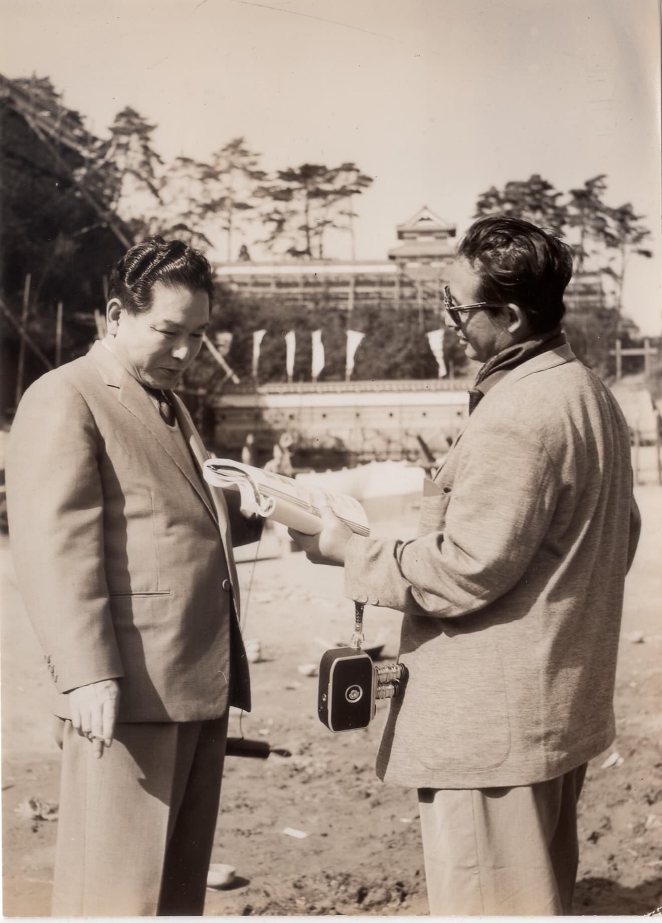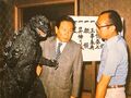 Tanaka (right) with Ishiro Honda and a Godzilla attraction suit