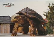 Toto's design was initially based on the pond slider, in reference to Gamera the Giant Monster, which used live pond sliders during filming; his final design was based on the African spurred tortoise.[13] To help make him appealing to children and to make him less "kaiju-like", he lacked any visible protrusions or roughness on his skin and shell.[14] Toto was originally planned to have glowing green eyes as an homage to the Showa Gamera. This is reflected in early promotional materials, and models of the green eyes were even prepared but never used.[15]