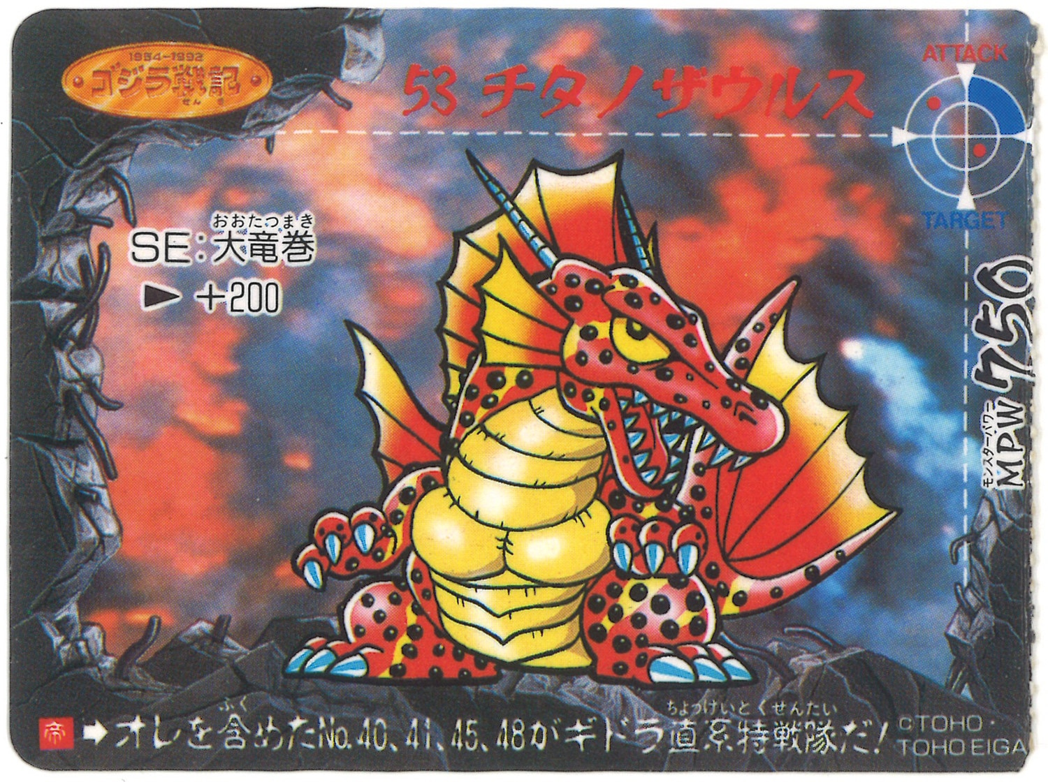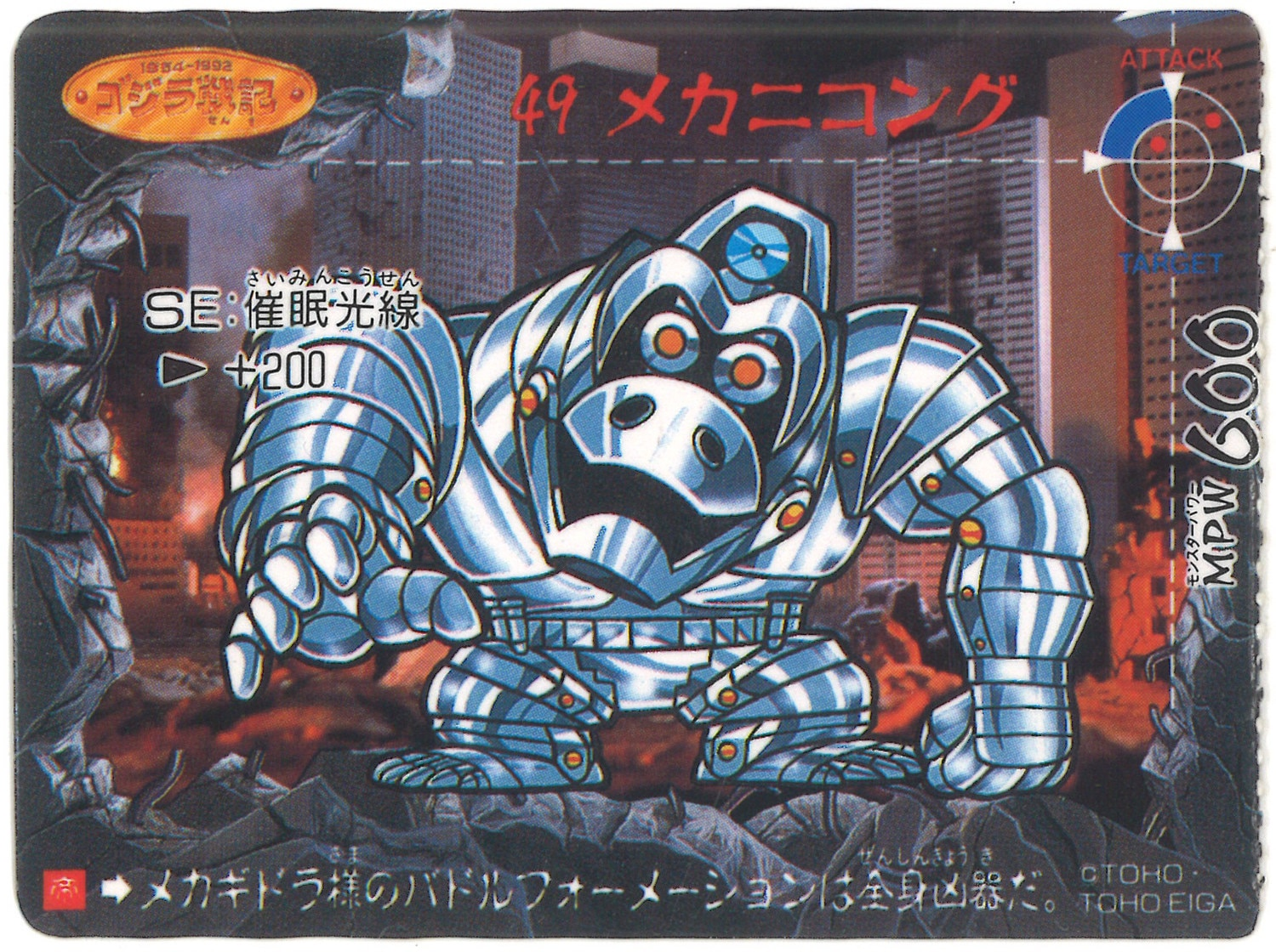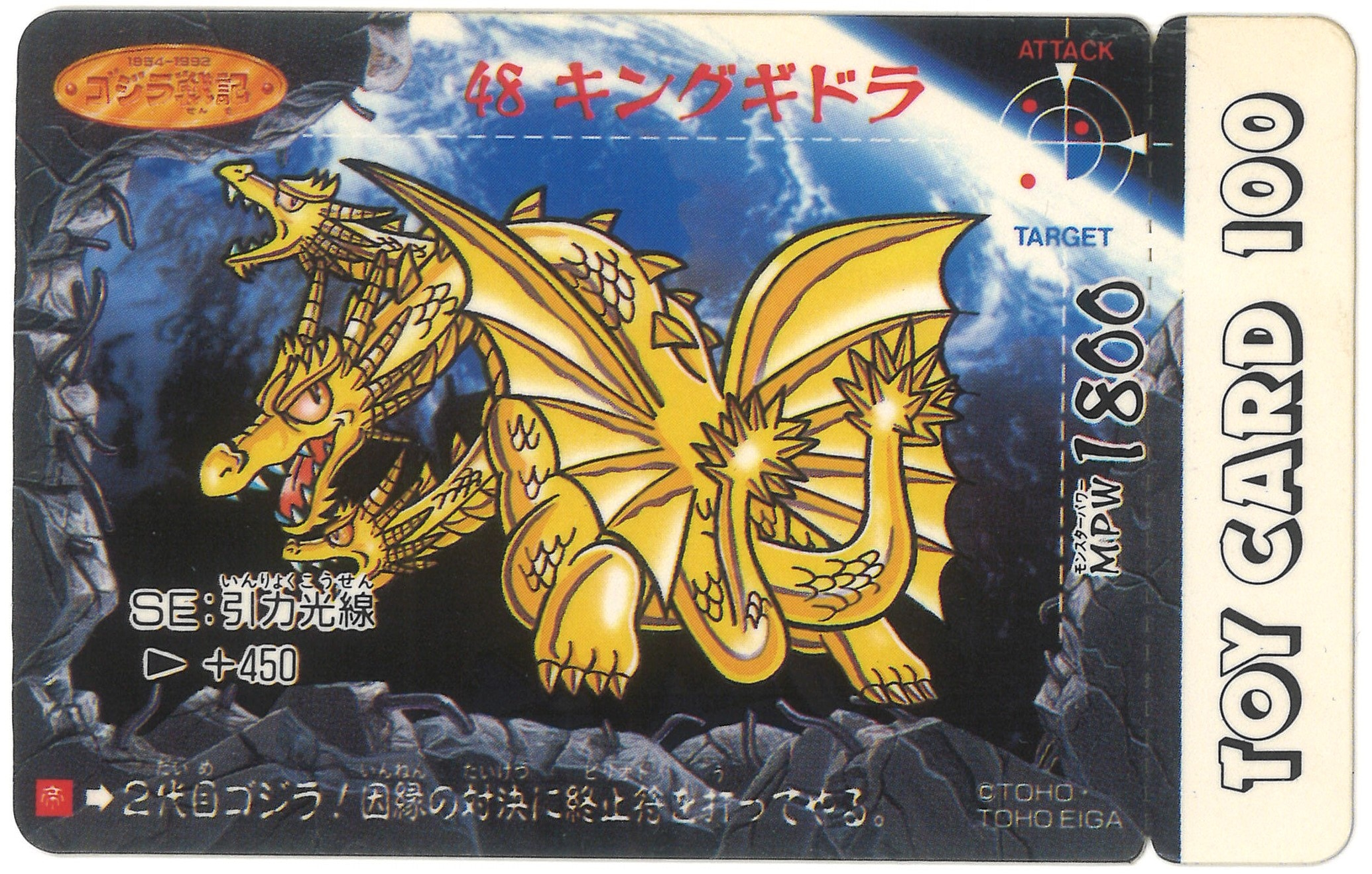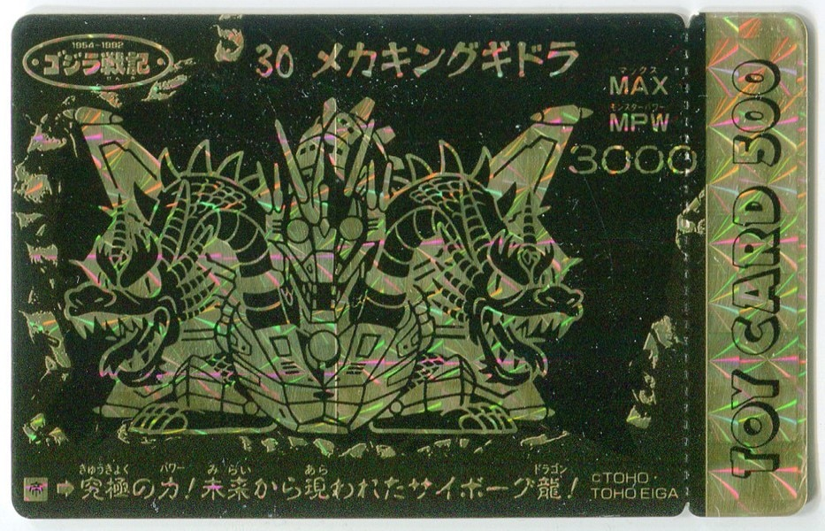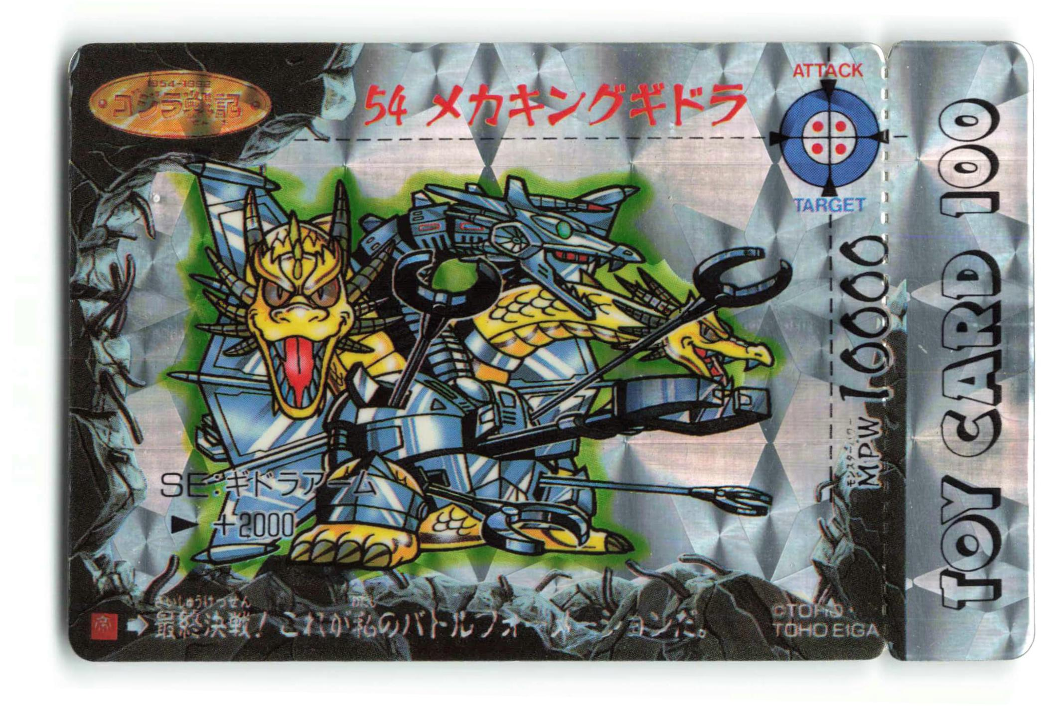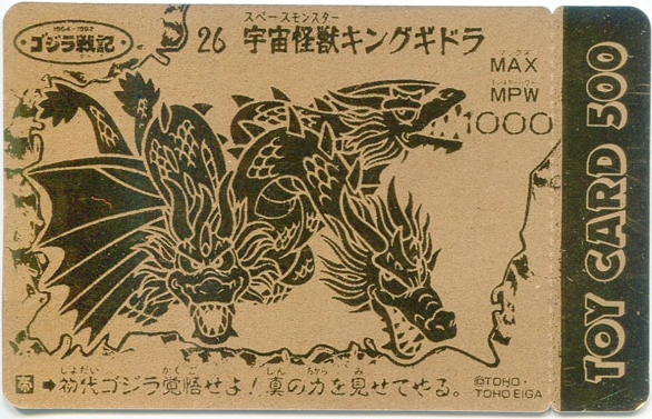 A second Godzilla series, Godzilla War Chronicle, was released in 1992 in celebration of Godzilla vs. King Ghidorah. This set consisted only of 54 cards and featured less unique monsters, but is notable for its more detailed art style. Like the previous set, each card was redeemable for a sum of yen, though this time the selection was interspersed with Toy Card 500 cards, worth 500 yen. Two "Special Version Sets" of Toy Card 500 cards were also available, consisting of six or 10 cards for a value of 3,000 or 5,000 yen, respectively.