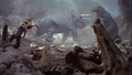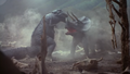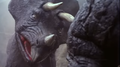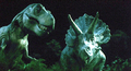 After Rainbow Mothra severed part of Cretaceous King Ghidorah's tail with another Cross Heat Rainbow Laser, a Triceratops and a Tyrannosaurus observed the appendage as it burrowed underground and stared at each other in concern.