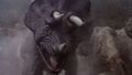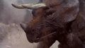 A Triceratops is seen protecting its young from an Allosaurus and wins after stabbing the Allosaurus with its horns, driving the carnivore away. Multiple Triceratopses are seen fleeing from the volcano as it erupts.