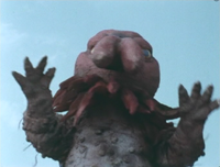 Trilorn appears peering over a hill in an amusement park where Monster Uncle and a group of children were playing with a ball. When the ball rolls onto a bridge, a woman named Eri goes to retrieve it, however on her way back to return it to the children they realize that the monster Trilorn is present whom begins rampaging. Monster Uncle hatches an idea to strap fireworks to the ball and launch it using a thick strip of elastic tied to either end of the bridge. He does so and launches the ball at Trilorn causing an explosion. The monster becomes agitated and begins spitting a pink gas from its mouth which begins to pollute the are where Monster Uncle and the children are standing, causing them to begin choking. Luckily, a hero emerges from the sky, Godman. He flies past Trilorn and fires a God-Spark at it before landing close by. He then enlarges himself to match the monster's height and they engage in a battle. After a drawn-out exchange of punches and kicks Godman is eventually able to knock Trilorn down and use his God-Sparks to destroy the monster. Trilorn was the thirty-fifth monster to battle Godman.