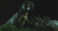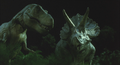 A Triceratops and a Tyrannosaurus watch Cretaceous King Ghidorah's tail burrow away