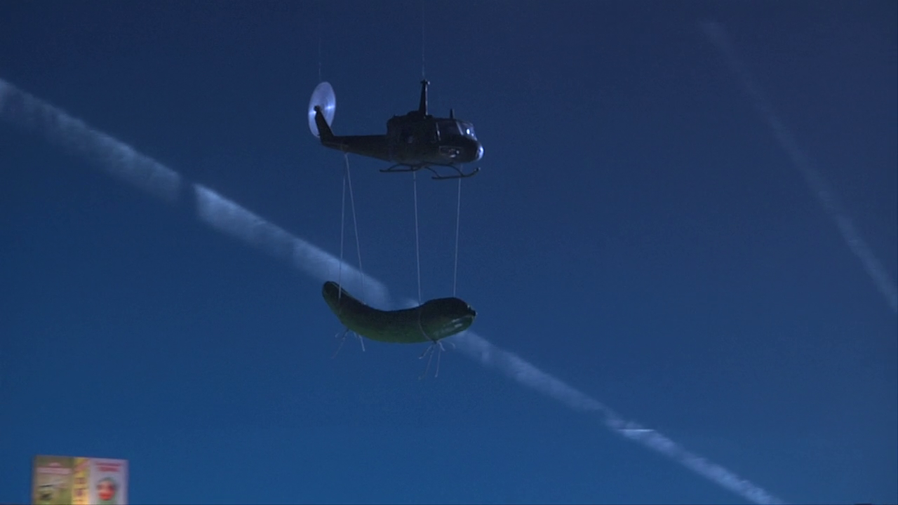 A UH-1 Iroquois carrying a giant cucumber in Death Kappa (2010)
