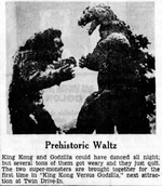— Newspaper advertisement for a drive-in showing of King Kong vs. Godzilla [10] |