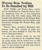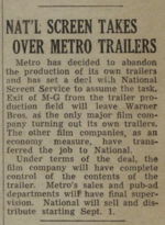 The National Screen Service did not produce and distribute trailers for all major companies; MGM and Warner Bros. produced and distributed trailers for their films until 1957 and 1967, respectively, when each transferred those duties to NSS.[2][3] Columbia began to produce and distribute their own trailers, posters and accessories starting in 1960; in response, NSS began to produce and distribute their own trailers for Columbia films to meet the needs of exhibitors on a "weekly service plan" that stipulated a supply of trailers for Columbia films in order to prevent the need to pay an additional fee for Columbia's own trailers.[4][5]