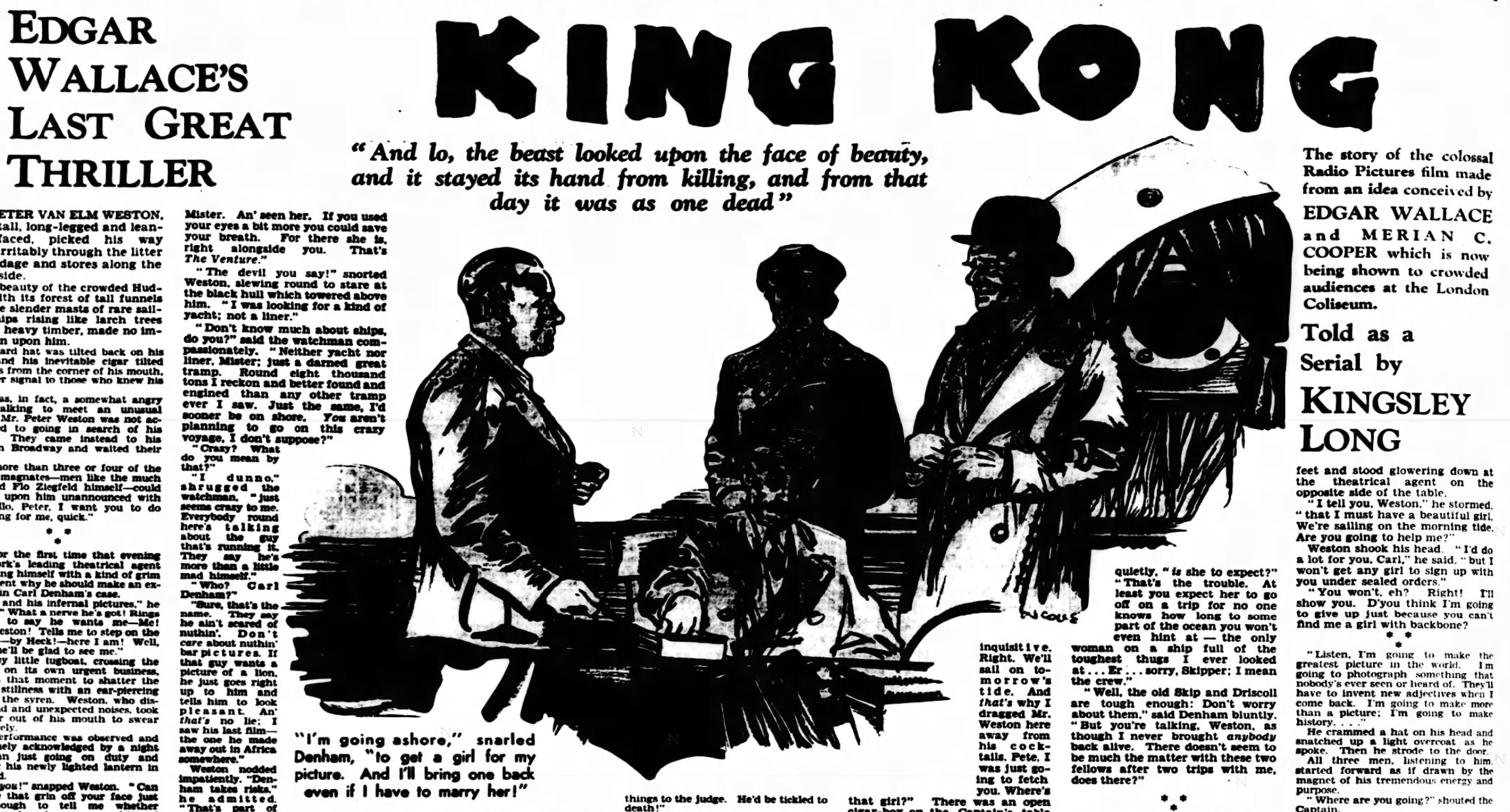 King Kong is the name of a newspaper serial adapted by Kingsley Long published in the London Daily Herald newspaper in 37 instalments from April 21st through June 1st of 1933. It was released daily except for Sundays, and Monday, May 1st. This adaptation is notable for being one of the first licensed Kong stories to expand upon the origins of Kong and the Skull Islanders.