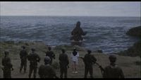 - 1944 - A Godzillasaurus appears on Lagos Island during a battle between American and Japanese forces, wiping out the American units and inadvertently saving the Japanese soldiers' lives. The dinosaur collapses from wounds it received from the Americans' artillery, and the Japanese garrison salutes it before returning to Japan. M11 and Emmy Kano use KIDS to teleport the wounded Godzillasaurus to the Bering Sea, expecting it to die far from nuclear testing.