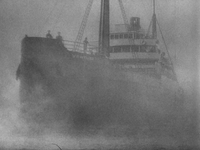 Not far from Sumatra, Carl told the captain that it was time to turn southwest. The Venture followed the new course for some time, but then Englehorn received a message about a warrant for Carl's arrest and an order to sail to Rangoon. At night, the ship turned again and soon sailed into a cloud of inauspicious fog. The ocean floor began to rise, and when the fog cleared, the remains of a huge wall sticking out of the water appeared ahead. Frightened, Englehorn tried to stop the Venture, but was unable to prevent it from crashing into the wall, damaging the bow. Englehorn and the first mate, Ben Hayes, tried to steer the ship to safety, but as soon as it began to maneuver, Jack and Jimmy noticed dangerous rocky buttes around them. Intense darkness, fog, and huge waves made the appear situation hopeless. Unable to turn in time, the Venture collided with a massive rock with a carved face and became stuck there, now with several holes in its hull. The sailors sealed the breaches, and the ship remained off the coast of Skull Island for the next day, awaiting the high tide. After Denham and his crew visited the island, resulting in the deaths of two men at the hands of the Skull Islanders, the crew, obeying Englehorn's order, began to dump ballast from the ship in a last attempt to sail away from the rock. Pounded by rain and spray from the waves, they failed to notice a Skull Islander sneak onto the ship, kill another sailor, and kidnap actress Ann Darrow from her cabin to sacrifice her to the giant ape Kong. The Venture took off and left the dangerous labyrinth of rocks, but Jack, having found a bone ornament lost by the abductor, raised an alarm. Englehorn armed a rescue team and set off with it to the island in two boats. The Venture spent the next day at anchor at a safe distance from the rocks, then transported the captured Kong to New York.