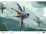 Vertacines are vaguely-avian creatures with gray-blue skin, bright yellow stripes, and large flipper-like wings. Their heads resemble a cross between a bowhead whale and a flamingo, with the skin under their chin resembling the skin folds of whales. Vertacines also have long, shark-like dorsal fins and a set of smaller wings on their hips. Fur spreads across their backs.
