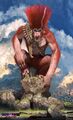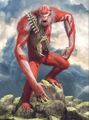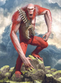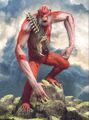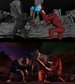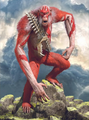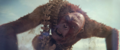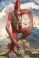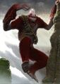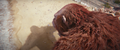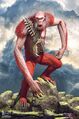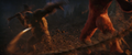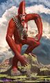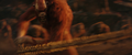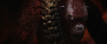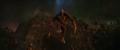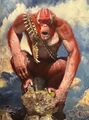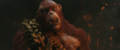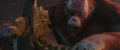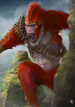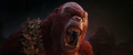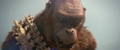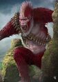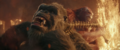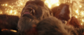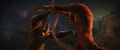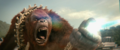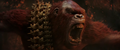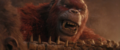 After the Skar King kicked the Great Ape Gnarled Finger into a lake of molten lava, the enraged Kong challenged the Red-Haired Conqueror. The Skar King proved to be an agile adversary, wielding his Whipslash far greater range than Kong's battle axe. Using it, he disarmed Kong and attempted to choke him. However, Kong fought back, flipping the Skar King over his shoulder, sending him crashing to the ground. The Skar King summoned Shimo and forced her to attack Kong with the blue crystal affixed to his Whipslash, compelling her to overcome her hesitation by inflicting pain on her using the crystal.