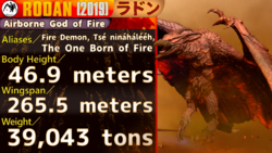 Physical Capabilities: Rodan is deadliest in the air. He easily dismantled the fleet of F-35 fighter jets engaging him by smacking them with his wings, tearing them apart with his talons and beak, and by performing a midair barrel-roll maneuver. During the battle in Boston, he utilized his aerial prowess to repeatedly ram Mothra while clawing at her with his talons.