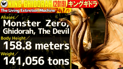 King Ghidorah was one of Monarch's most recent findings, discovered frozen in the Antarctic ice by a team headed by Dr. Vivienne Graham prior to 2014. Given the designation "Monster Zero," the three-headed Titan was the largest specimen they had uncovered — his name and origins shrouded in mystery. Only after Ghidorah was unleashed upon the world once more did they learn the truth: he was an alien invader bent on wiping out all life on Earth so he could terraform the planet to his liking. Godzilla and Mothra joined forces to seal him beneath Antarctica several millennia ago.