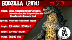 The Godzilla 2014 kaiju profile is the 3rd episode of Wikizilla's Kaiju Profiles video series. It was uploaded on January 22, 2017.