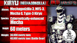 The Kiryu kaiju profile is the 12th episode of Wikizilla's Kaiju Profiles video series. It was originally uploaded on May 6, 2017.