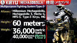 Kiryu’s name comes from the japanese words Ki and Ryu, which together mean “Machine Dragon.” Kiryu's primary legal name is simply "Mechagodzilla," while his official designation in the films is "MFS-3," which is short for "Multipurpose Fighting System Type-3." "Kiryu" is also trademarked by Toho, as seen in the copyright information for the game “Godzilla: Unleashed.”