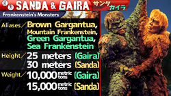 While "The War of the Gargantuas" itself seems to retcon the events of "Frankenstein vs. Baragon," placing Sanda in Frankenstein's metaphorical shoes, later media treat the film as a straightforward sequel. In any case, Sanda was raised by scientists in a Japanese laboratory, who originally called him Frankenstein. Though a peaceful monster, he escaped and seemingly met his end at Mt. Fuji. A piece of flesh he lost at Lake Biwa floated into the Pacific Ocean, where it grew into Gaira by feeding on protein-rich plankton.