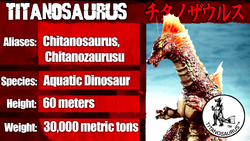 The Titanosaurus kaiju profile is the 4th episode of Wikizilla's Kaiju Profiles video series. It was uploaded on February 11, 2017.