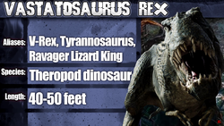 The Vastatosaurus rex kaiju profile is the 14th episode of Wikizilla's Kaiju Profiles video series. It was uploaded on June 13, 2017.