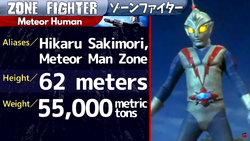 Transformation: Hikaru Sakimori and his siblings can assume their Zone forms by shouting "Zone Fight Power" while pointing toward the sky. In this state, his crazier feats include resisting Goram's attempts to step on him and an energy beam from Spideros. Hikaru can further transform into his giant state by shouting "Zone Double Fight," and is the only member of his family with the ability to do so. Hikaru may also transform from his human state directly into giant form and can willingly shrink back down again. He may also be forcibly returned to regular size if he runs short on power or sustains too much damage, the latter being the case during one of his battles against King Ghidorah.