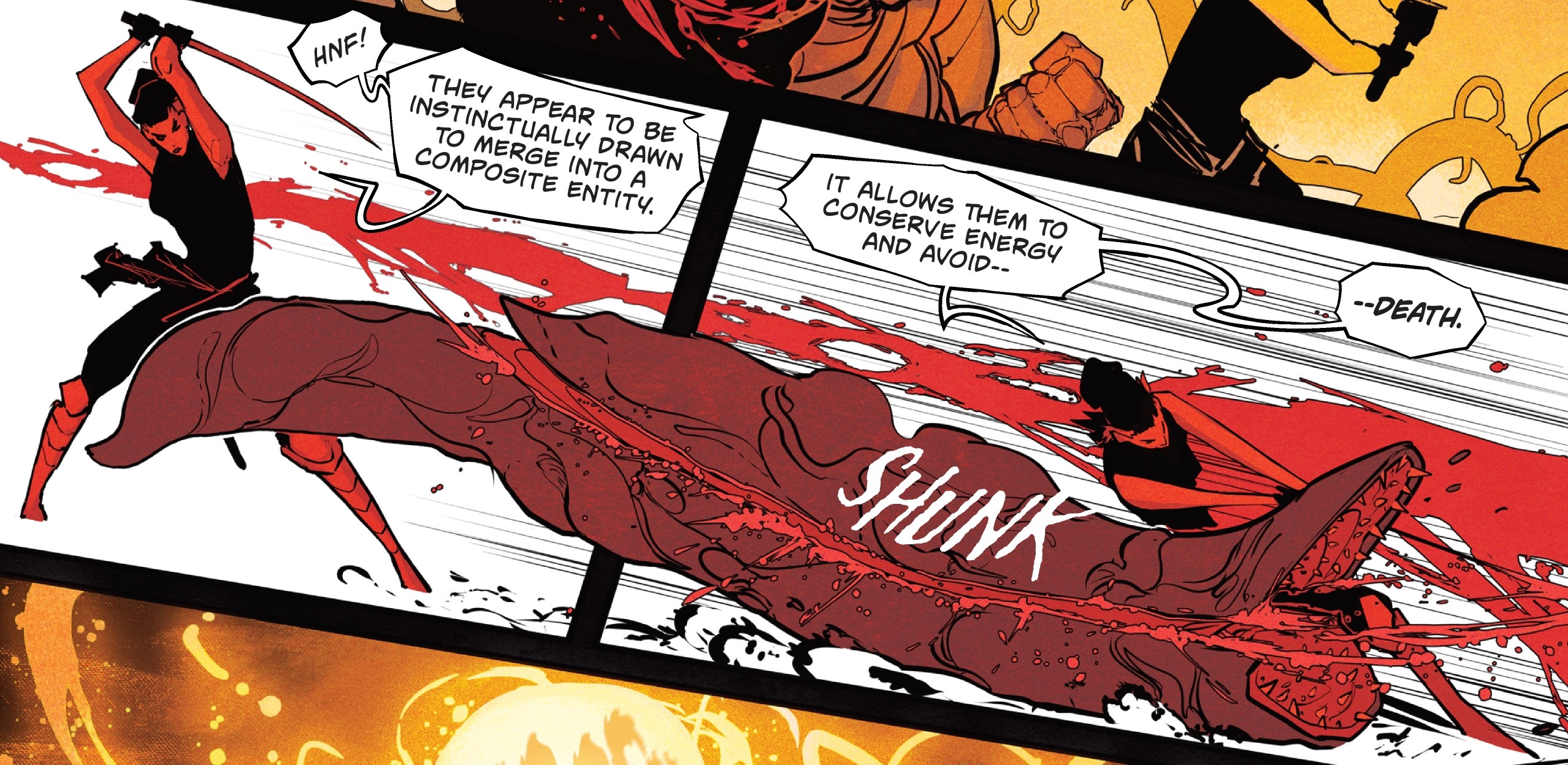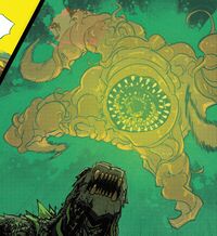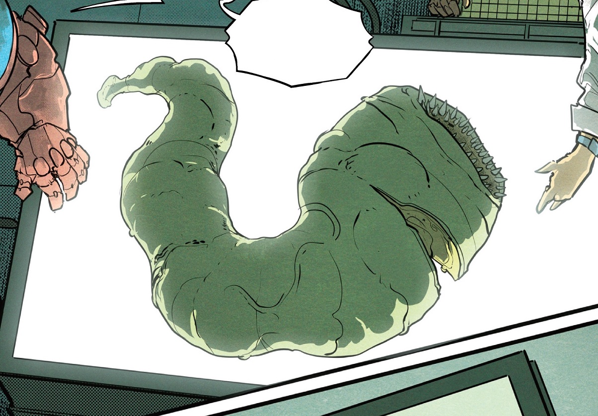 A mysterious kaiju watched the battle from her monitors. She deemed the name "Yacumama" fitting, even if she wished she could have named it herself, before reaching into a tower full of bubbling green liquid and grabbing a handful of smaller Yacumama. As the larger Yacumama reached the deck of the cargo ship, now in flames, Godzilla fought off smaller roundworms underwater.