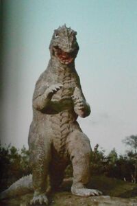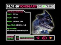 - ↑ The 1999 Yonggary's height varies between sources. A bonus feature included with the American DVD release of Reptilian states his height to be 500 meters,[3] and the official Korean promotional site for the film says he is 150 meters (nearly 500 feet).[4] However, the English version of the site instead calls him a "350 foot tall [...] monster,"[5] and the Japanese theater program for the film places him at 106 meters (about 350 feet). Furthermore, Yonggary's height is estimated in the film itself as "50 times the size of a T. rex". As the largest Tyrannosaurus rex specimen currently known is just over 4 meters tall at the hip, this would place Yonggary's maximum height at around 200 meters.